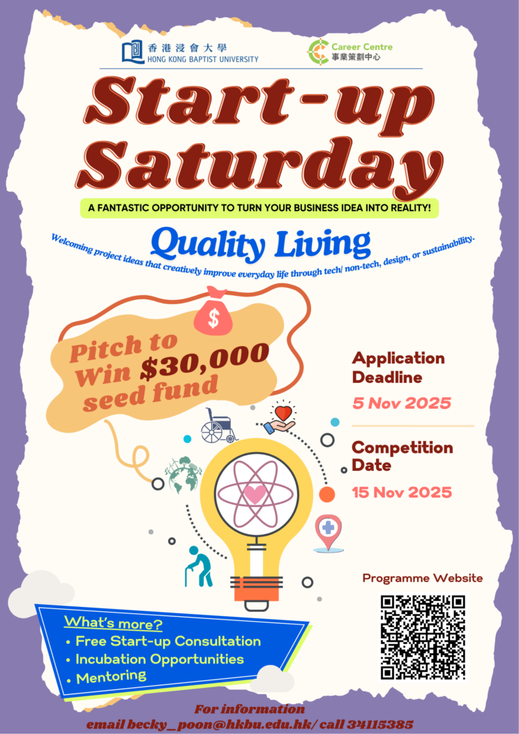 Start-up Saturday provides students with opportunities for entrepreneurship through start-up consultation, seed funding, mentoring, and more. Applicant teams will attend the final presentation, and winning teams will receive seed funds and access to external incubation programmes and funding schemes.