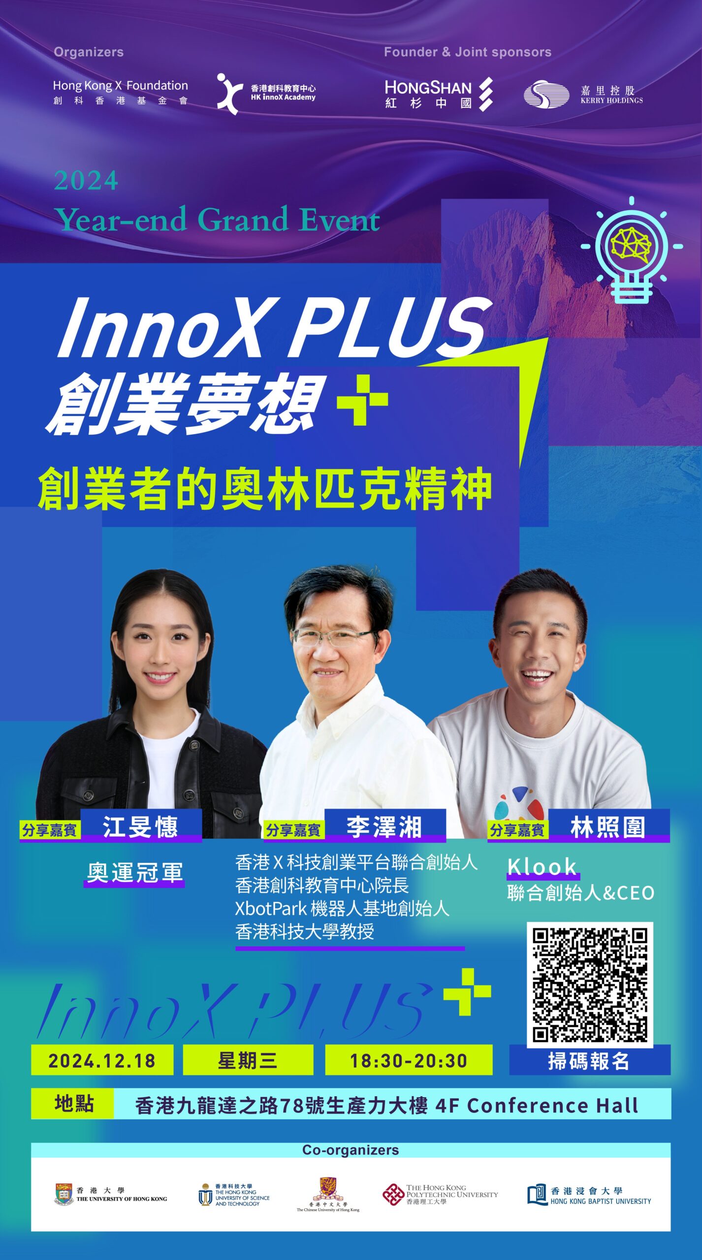 為鼓勵年輕人探索科技創新與創業,香港各大學推出「InnoX PLUS創業夢想+」第二季,邀請知名嘉賓分享創業經驗。活動將於12月18日舉行,主題為“創業者的奧林匹克精神”。