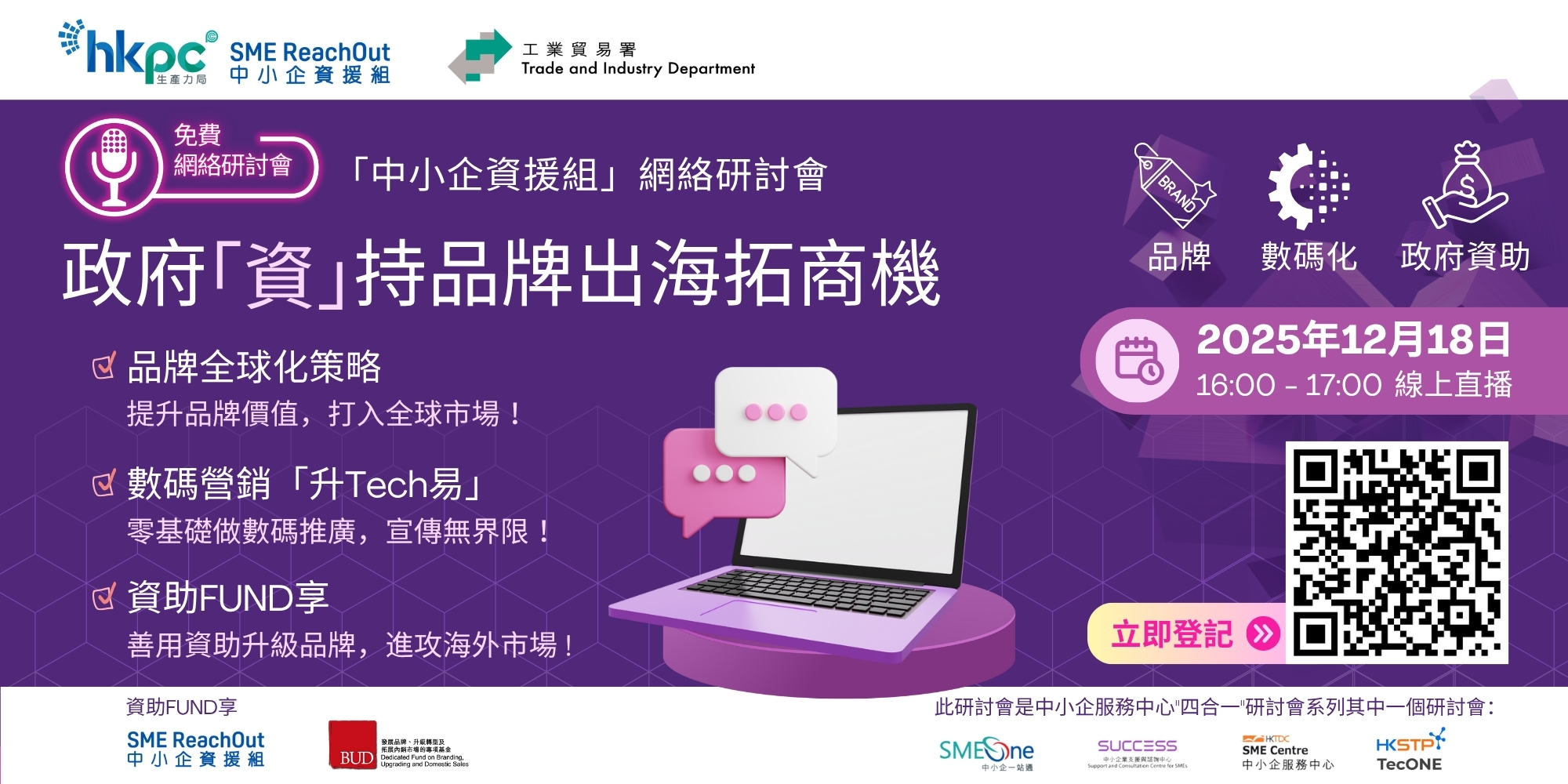 「中小企资援组」网络研讨会将与您剖析品牌全球化策略,分享「升Tech易」数码营销秘技,助本地品牌轻鬆拓展!「资助FUND享」环节,教您善用政府资助,加速品牌升级与市场拓展,解锁品牌成功!