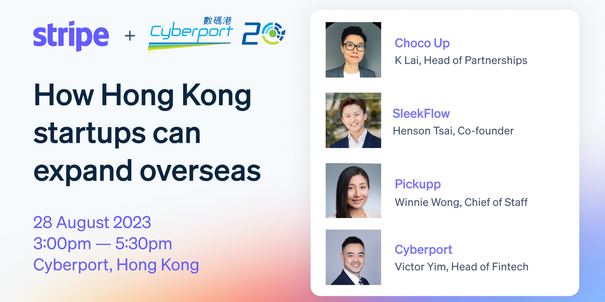 Join us for a founders’ networking and panel discussion with revered Cyberport startups on how they expanded their business to other markets with their go-to-market strategies while using Stripe’s payments infrastructure.
