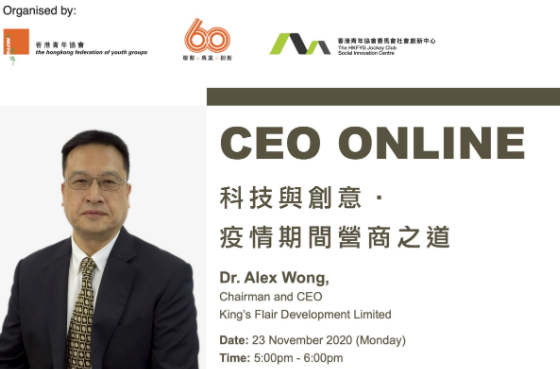 CEO Online – 科技與創意.疫情期間營商之道 Topic: 科技與創意.疫情期間營商之道 Date: 23 November 2020 (Mon) Time: 5:00pm – 6:00pm Speaker: Dr. Alex Wong, Chairman and CEO, King’s Flair Development Limited Channel: Zoom Language: Cantonese Enquiries: Email: sic@hkfyg.org.hk / Tel: 3595 0945 For more information,…