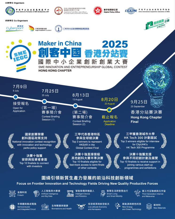 新聞 第12屆香港大學生創新及創業大賽 瀏覽更多 2026年02月02日 投資推廣署二零二五年招商成果亮麗 彰顯環球投資者對香港前景充滿信心 瀏覽更多 2026年01月26日 駐港公司和初創企業數目再創新高反映香港無可比擬優勢 瀏覽更多 2026年01月26日 BOCHK Science and Technology Innovation Prize (STIP) 2025-2026 瀏覽更多 2025年12月18日 香港青年創業計劃 (YBHK) 瀏覽更多 2025年12月18日 HICOOL 2026 全球創業大賽 瀏覽更多 2025年12月10日 創新創業博士後計劃 瀏覽更多 2025年12月10日 Ignite Your Innovation: Hong Kong Techathon+ 10th Anniversary Edition! 瀏覽更多 2025年11月26日 DeepTech100+ 瀏覽更多 2025年11月12日 IOT Data Hackathon 2026 瀏覽更多 2025年11月12日 都大Hackathon 2026 瀏覽更多 2025年11月12日 Venture Ready Bootcamp 瀏覽更多 2025年11月12日 HeyMax Launches in Hong Kong and Announces Partnership with Cathay 瀏覽更多 2025年11月06日 beVisioneers: The Mercedes-Benz Fellowship is looking for aspiring eco-preneurs in Hong Kong! 瀏覽更多 2025年10月29日 GoGBA大灣區考察團深圳珠海12月16-17日 瀏覽更多 2025年10月23日 2026香港InnoX Camp創科訓練冬令營 瀏覽更多 2025年10月23日 數碼港大灣區青年創業計劃 瀏覽更多 2025年10月23日 2026 Hong Kong Web3 Ideathon: AI, FinTech & Financial Literacy 瀏覽更多 2025年10月23日 回收基金十週年案例比賽: 創新以永續 瀏覽更多 2025年10月23日 Start-up Saturday 瀏覽更多 2025年10月23日 JUMPSTARTER ZPIRE 瀏覽更多 2025年10月22日 亞洲網紅創意大賽 瀏覽更多 2025年08月22日 Campaign Asia Startup Pitch Competition is now open for submission! 瀏覽更多 2025年08月07日 2025「創客中國」國際中小企業創新創業大賽 – 香港分站賽 瀏覽更多 2025年07月30日 跨代「商」連・青年創業計劃 瀏覽更多 2025年07月17日 亞洲智慧創新大獎 2025 瀏覽更多 2025年06月25日 Deep-Tech Lab Business Executives Program 瀏覽更多 2025年06月18日 Deep-Tech Lab Incubation Program 2025-26 瀏覽更多 2025年06月18日 Google | HKSTP Rocketing AI Co-Incubation Program 2nd Cohort 瀏覽更多 2025年06月11日 理大國際未來挑戰賽 瀏覽更多 2025年06月11日 « 上一頁 下一頁 » Skip back to main navigation
